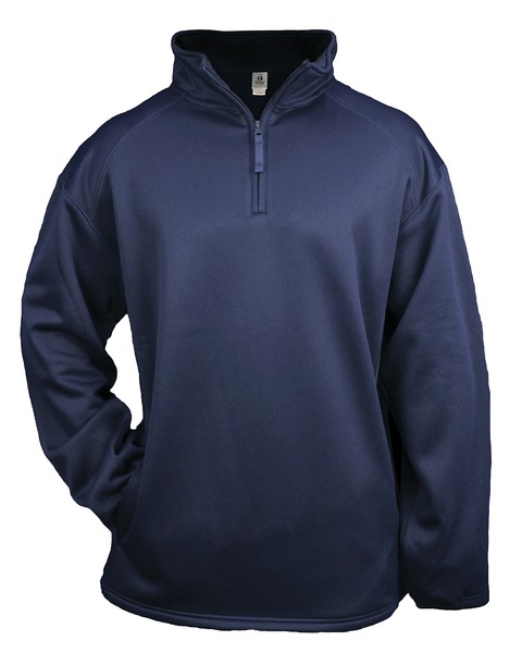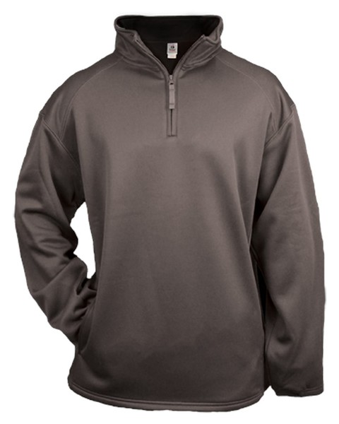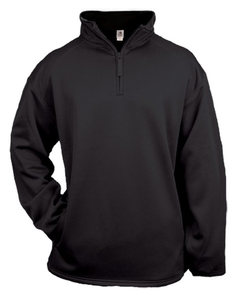 1/4 Zip front with self fabric collar. ; Two front pockets with headset opening.; Open bottom. Cuffs feature smooth hem front with rib on back half.; Embroidered Badger logo on left sleeve.;